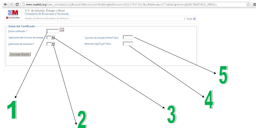 El siguiente enlace de la Comunidad de Madrid, recuerda que en cada Comunidad Autónoma tienen procedimientos distintos para la obtención de la Etiqueta energética.En Castilla la Mancha (Guadalajara), la etiqueta la envian directamente al domicilio don de lo hemos inducado en la instancia,una vez registrado la certificación energética, no hay que hacer nada más.